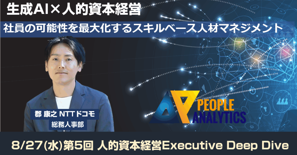 その「人的資本経営 Executive Deep Dive」の第5回目のセッションを2025年8月27日(水)14:00~15:00にオンラインで開催します。第5回目のゲストは株式会社NTTドコモ総務人事部人事戦略担当部⾧の郡 康之さんをお迎えします。今回は「生成AI×人的資本経営 -社員の可能性を最大化するスキルベース人材マネジメント」と題してお話しさせて頂きます。