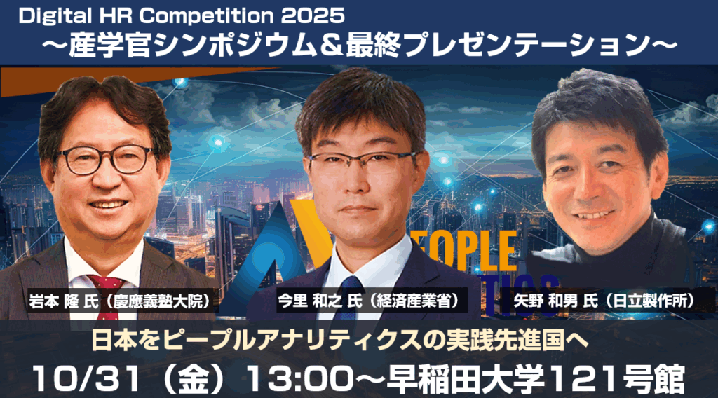 2025年度のDigital HR Competitionが、いよいよ10月31日(金)に最終プレゼンテーションを迎えます。本年はHRテック部門はHRテクノロジー大賞(主催:ProFuture株式会社)に移管し、年々ハイクオリティーなエントリーが増えている「ピープルアナリティクス部門」に焦点を絞って行うことになりました。そして本年のテーマである「日本をピープルアナリティクスの実践先進国へ」という言葉にふさわしい先進的でインパクトのある分析事例が期待できそうです!