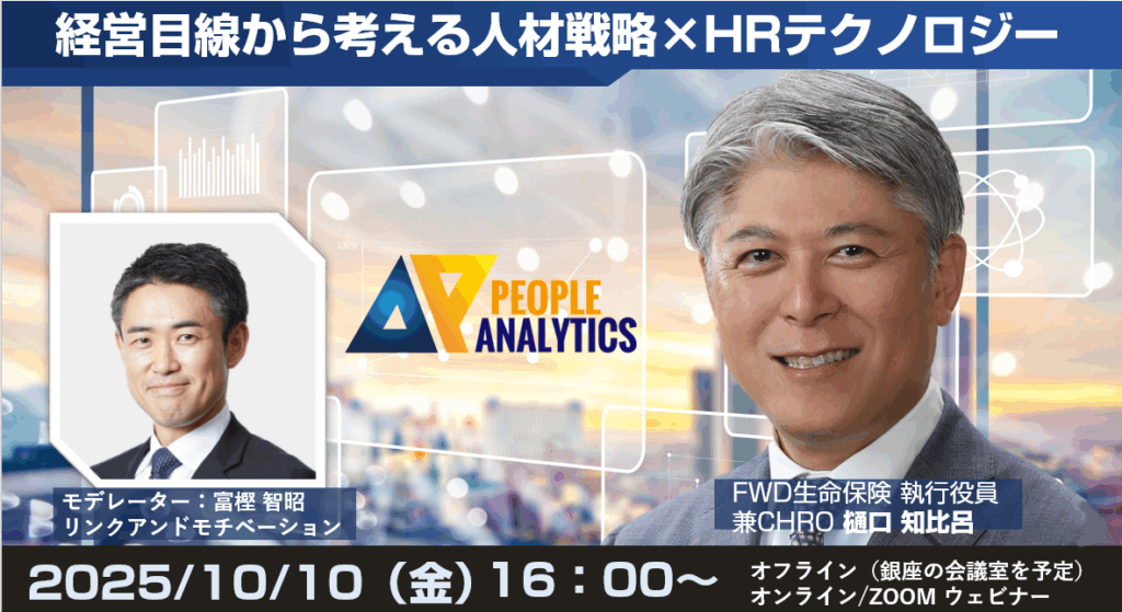 その新しいワーキングの第二回目セミナーを10/10(金)16:00~オフライン/オンラインで行います。今回はゲストスピーカーとしてFWD生命保険株式会社 執行役員 兼 CHRO 樋口知比呂様にお願いしました。モデレーターはワーキングリーダーの冨樫 智昭氏(株式会社リンクアンドモチベーション企画室 エグゼクティブディレクター)が務めます。FWD生命保険様の経営戦略、人事戦略に加え、HRテクノロジーやアナリティクスがどのように活用されるのか?その期待感も含めトークセッションで深堀していきたいと思います。是非ご参加ください!