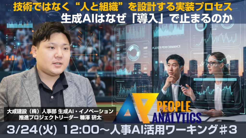 3月24日(火)12:00~13:00に第3回「人事AI活用WGセミナー」をオンラインにて開催いたします。今回は、大成建設株式会社管理本部人事部人財研修センター生成AI・イノベーション推進 プロジェクトリーダーの糠澤研太さんをお招きし、「生成AIはなぜ「導入」で止まるのか― 技術ではなく“人と組織”を設計する実装プロセス ―」というテーマでお話しいただきます。