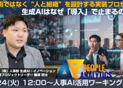 3月24日(火)12:00~13:00に第3回「人事AI活用WGセミナー」をオンラインにて開催いたします。今回は、大成建設株式会社管理本部人事部人財研修センター生成AI・イノベーション推進 プロジェクトリーダーの糠澤研太さんをお招きし、「生成AIはなぜ「導入」で止まるのか― 技術ではなく“人と組織”を設計する実装プロセス ―」というテーマでお話しいただきます。